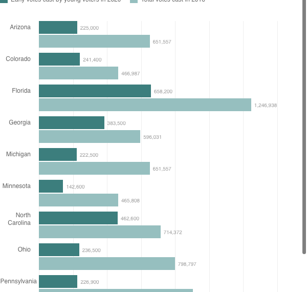 In a few states, the number of early votes cast by 18- to 29-year-old voters has exceeded the number of early votes by that age group in 2016, as of Oct.