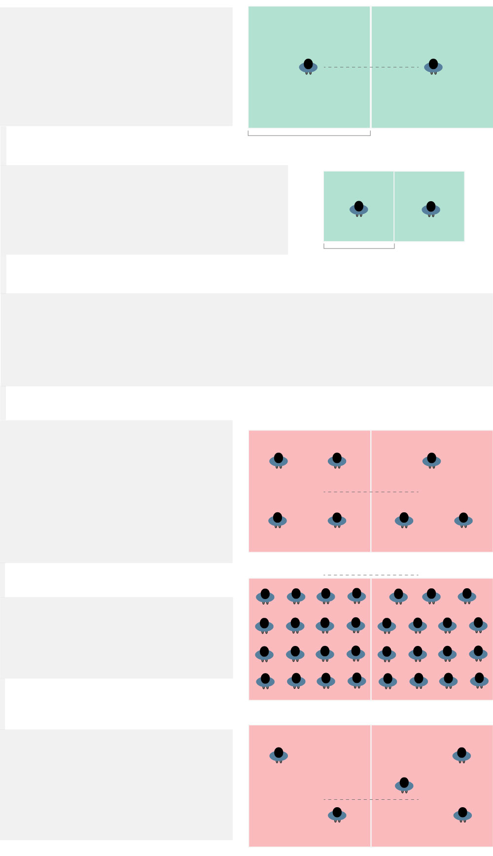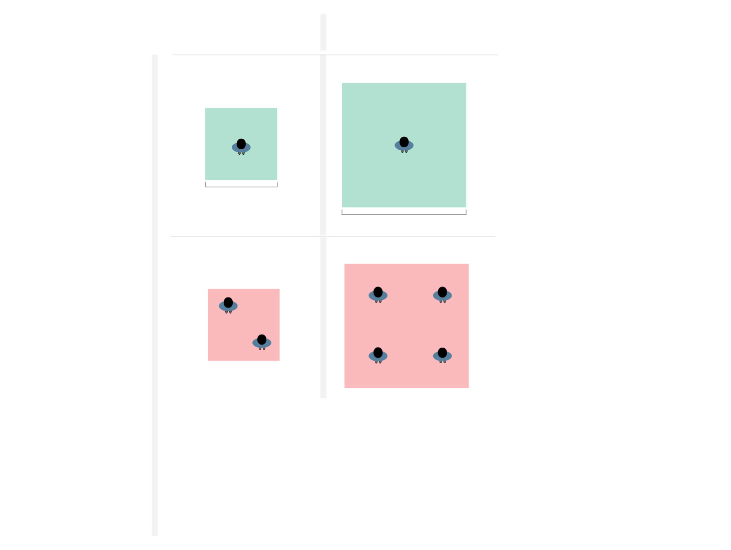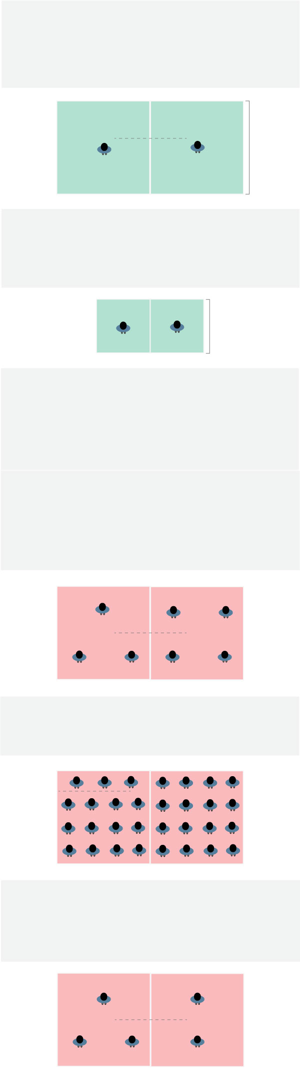 Projections are based on the Red Cross' recommendation of 20 square feet per person before COVID-19 and 60 square feet per person during the pandemic. A person is roughly 1 x 1.25 feet while standing in this representation. All representations are meant to be true to scale but are approximate.