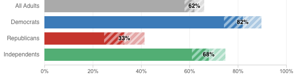 Share of respondents who say they will trust the results of the 2024 elections, even if the candidate they support loses. Shaded areas of the bars are within the margin oferror.