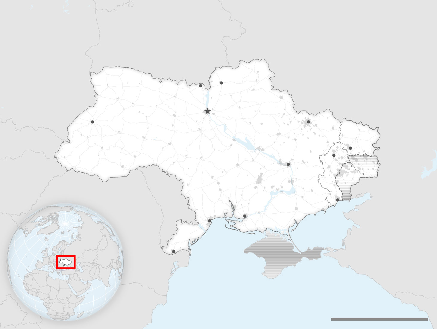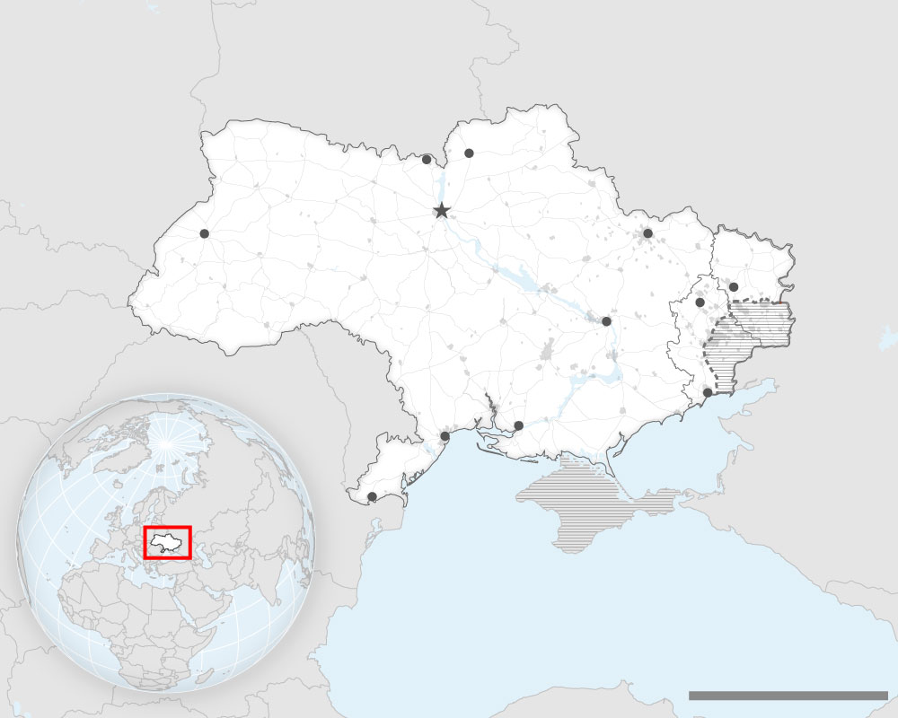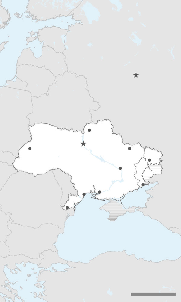 Notes: The area of separatist control is approximate and reflects the state of things before the Feb. 24, 2022, invasion. Gray shading within Ukraine represents urban areas.