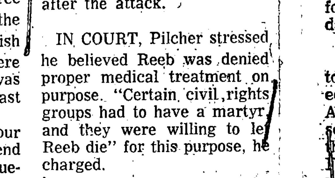 The civil rights movement needed a white martyr, Pilcher told jurors. He argued that civil rights activists had delayed getting Reeb medical treatment and let him die — or killed Reeb themselves.