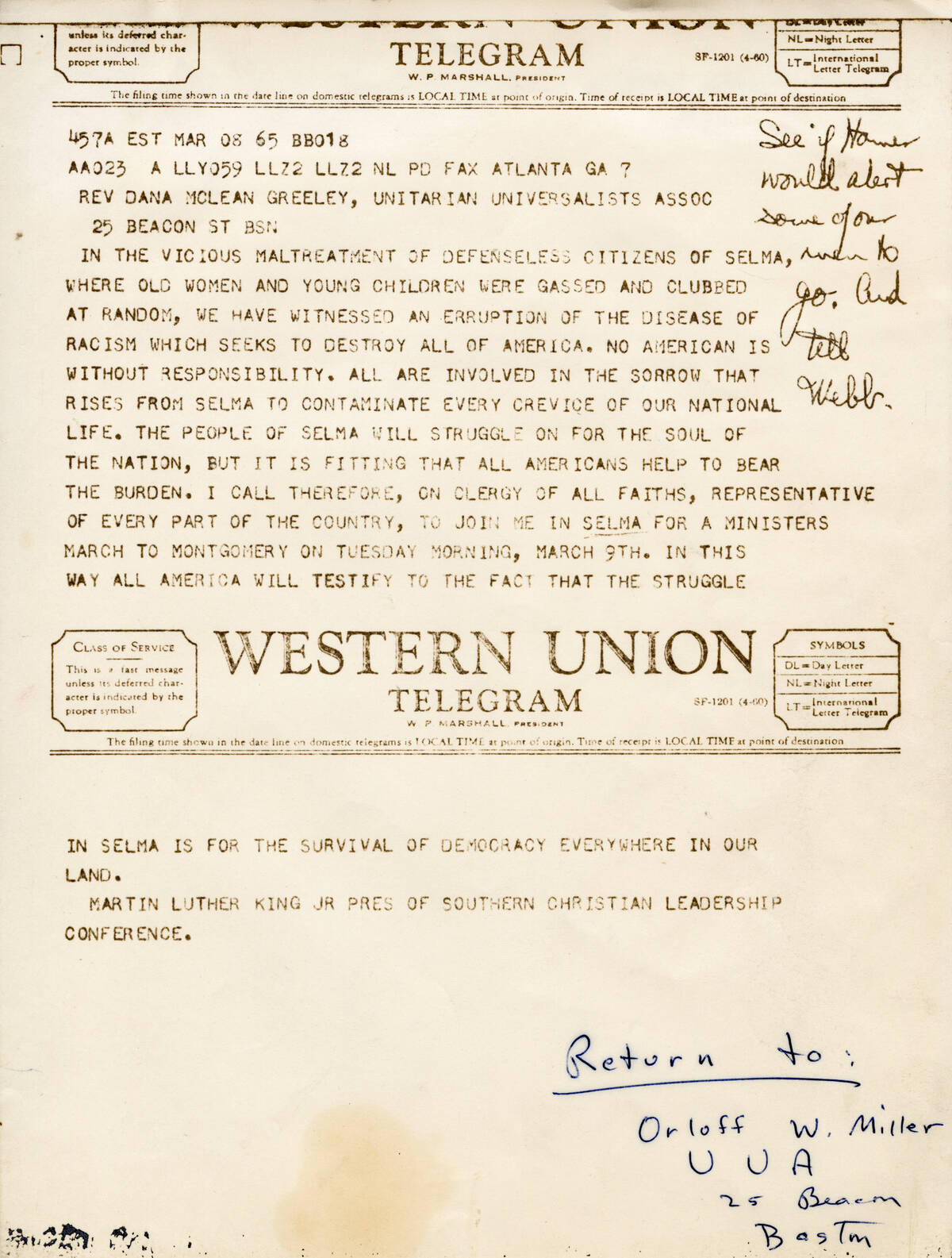 When the Rev. Martin Luther King Jr. sent a telegram the next morning calling on clergy across the country to come to Selma, Reeb bought a plane ticket.