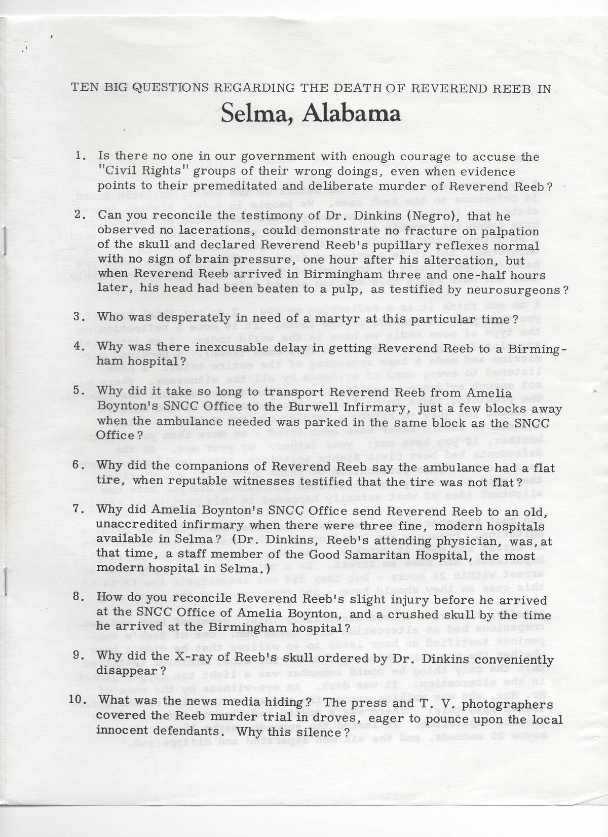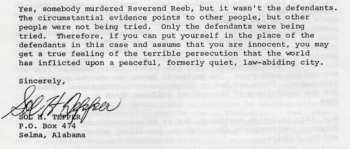 A few weeks after the trial, Sol Tepper, a leader of Selma’s all-white Citizens Council and an outspoken segregationist, distributed a seven-page letter amplifying Pilcher’s closing argument.